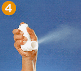 6.息をゆっくり吐き出します。ファイソンエアーを水平にして吸い込み口を唇で加えます。缶の上部を強く押してエアロゾルを1回噴霧し、息をゆっくりと深く吸い込みます。