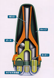 「イーヘラー」の内部構造です。本体内部にボールが仕込まれています。息を吸い込むとこれが回転してドライパウダーを撹拌し細かい粉にします。ボールが回ると”ルゥ〜”という音がします。
