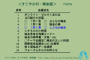 「すこやか村・喘息館」とは、大手ネットワーク NIFTY SERVE 内に設けられた喘息患者とその家族の学習と交流目的とした電子会議室で構成されるフォーラムです。
