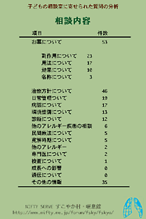 相談の内容で最も多かったものが、お薬についての 53件です。中でも副作用についての相談が23件ありました。次が治療方針についての46件。この中には「このままでよいのでしょうか」といった、いわば”つぶやき型”の質問も多く含まれています。そして次に日常生活の管理についてが19件と続いています。
