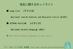 アメリカではの National Jewish Medical and Research Center(NJRC) の"Lung line"が有名です。イギリスの National Asthma Campaign(NAC) の "ASTHMA HELPLINE" などがあります。またオーストラリアのNational Asthma Campaign も現在準備中と言われています。これらの支援活動が「すこやか村・喘息館」や「喘息デー」のモデルになっています。