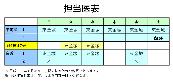 平成20年(2008)1月より、月曜日と金曜日の夕方の西藤医師の診察はなくなります。土曜日の午前の診療のみとなります。気管支喘息やアトピー性皮膚炎などで定期的に通っておられる患者さんは、注意して下さい。