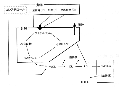 血中のコレステロールは、食事の中にふくまれるコレステロールのほかに、脂肪、糖質、タンパク質から肝臓でつくられます。ここでつくられたコレステロールは、比重の一番軽いリポ蛋白、すなわちVLDLコレステロールとして血中に放出されます。このVLDLからしだいに脂肪酸が遊離し、LDLコレステロールとなり、このLDLコレステロールが血管壁に取り込まれるために動脈硬化を起こします。また、ほかの血中のLDLは肝臓に再び取り込まれ、肝臓で取り込まれたLDLは胆汁となり消化管に排泄されます(図2)。このため、高コレステロール血症の治療は、食物中の脂肪、タンパク質、炭水化物をバランスよく摂ることにより、肝臓でのコレステロールの過剰な生成を押さえようとするための食事療法を行います。この食事療法を行うにあたって、食物中のタンパク質(P)、脂肪(F)、炭水化物(C)をバランスよく食べる指標として「PFCバランス」ということばがあります。これは、必要なカロリーをタンパク質は12〜13%、脂肪が20〜30%、炭水化物が57〜68%の割合で摂ることが適量とされています。ところが、わが国の5歳の小児の年次別PFCバランスを見ると、1952年には脂肪が12.6%であったのが、1970年には28.4%、1982年には33.8%となってきています。日本人、とりわけ小児のこのような脂肪の摂りすぎが、小児の血中コレステロール値を上昇させているものと思われます。このため、とくに脂肪の摂りすぎに注意する必要があります。