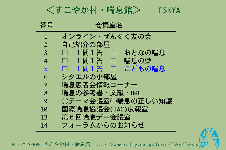 「すこやか村・喘息館」とは、大手ネットワーク NIFTY SERVE 内に設けられた喘息患者とその家族の学習と交流目的とした電子会議室で構成されるフォーラムです。