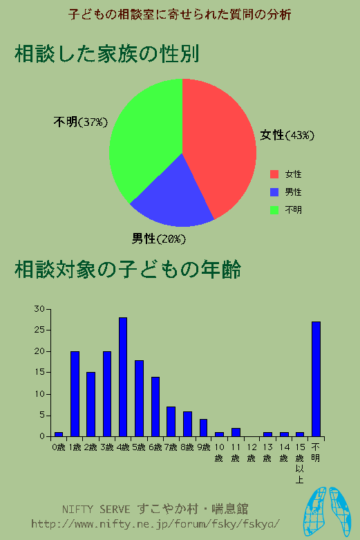 この会議室に質問を寄せる方の性別は、男性 19.9%、女性 42.8%、不明 37.3% でした。つまり母親からの質問が多いことが分かりました。