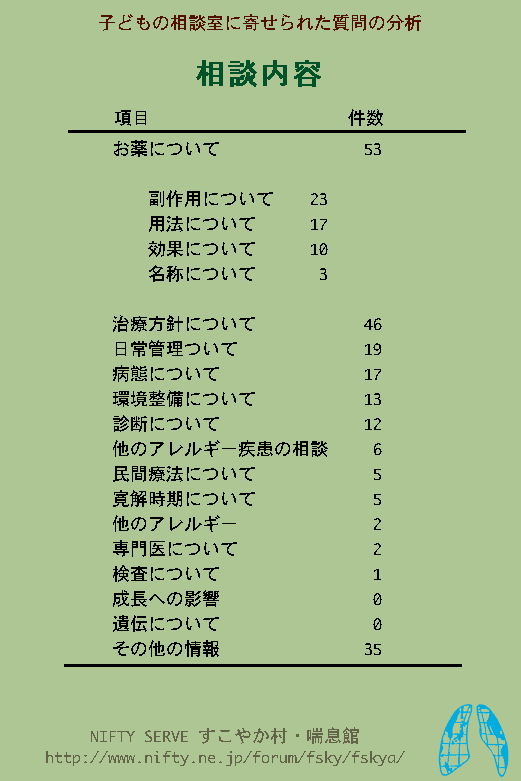 相談の内容で最も多かったものが、お薬についての 53件です。中でも副作用についての相談が23件ありました。次が治療方針についての46件。この中には「このままでよいのでしょうか」といった、いわば”つぶやき型”の質問も多く含まれています。そして次に日常生活の管理についてが19件と続いています。