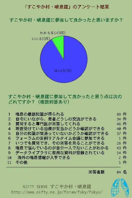 当フォーラムを利用されている方に電子会議室のやり取りについて感想を尋ねました。91%(84/92)の方からフォーラムに参加していて良かったと言う感想を頂きました。また、どの様な点で良かったのかを尋ねると、最も多かった回答が「喘息の最新知識が得られる」の 69 件、そして「質問すると専門医が回答してくれる」の 46件でした。