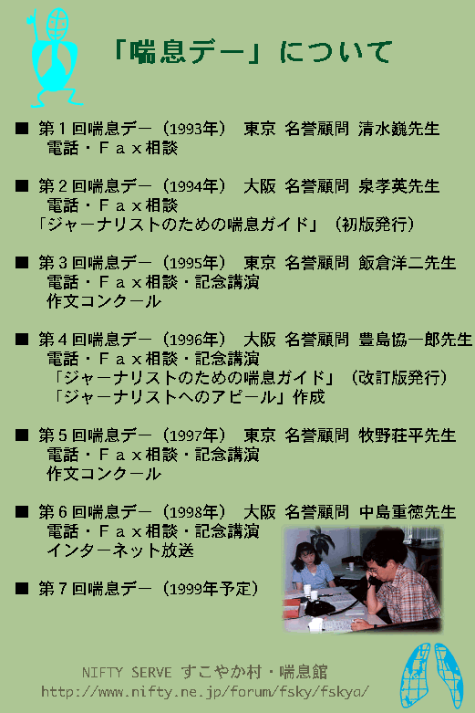 「すこやか村・喘息館」では、電子会議室を利用し喘息患者やその家族に対して喘息に関する情報を提供してきましたが、これとは別に、「喘息デー」と題した電話・Fax相談などのイベントの運営も電子会議室を利用し行っております。