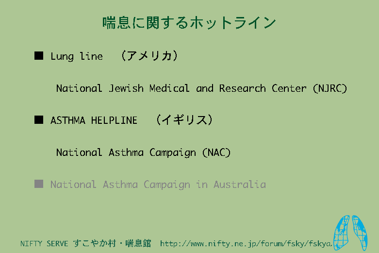 アメリカではの National Jewish Medical and Research Center(NJRC) の"Lung line"が有名です。イギリスの National Asthma Campaign(NAC) の "ASTHMA HELPLINE" などがあります。またオーストラリアのNational Asthma Campaign も現在準備中と言われています。これらの支援活動が「すこやか村・喘息館」や「喘息デー」のモデルになっています。