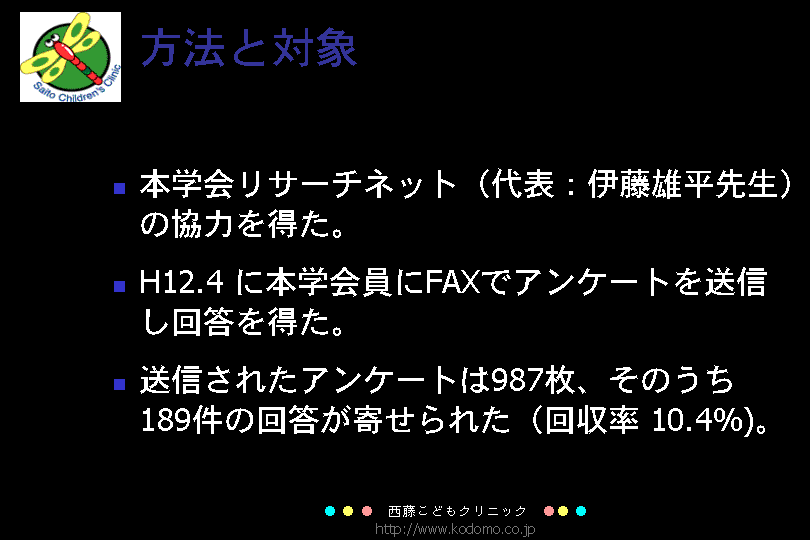 方法と対象ですが、平成12年4月にリサーチネットより本学会員に次のスライドでお示ししますアンケートを FAX で送信し回答を求めました。