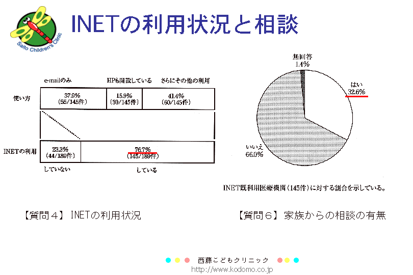 医療相談は、INET利用医療機関の32.6%と、ほぼ1/3の利用者が届いた経験があると答えています。(注:レイアウトの問題で先に質問6を説明しました)