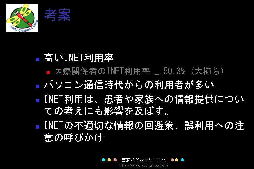 しかし、INETの普及は著しく遭遇した問題の解決にINETの利用は常套手段となっており、もはや患者さんにINETの利用を止めさせる事は困難となっております。どの様に使うか、どの様な情報支援を行うかを検討すべき時代に入ってきております。