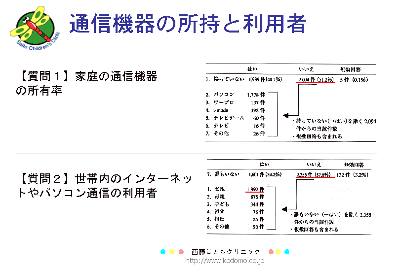 まず家庭内のインターネットが利用できる通信機器の有無と種類ですが、51。2%が所持しており、その内訳はパソコンが最も多く1778件、次いでi-modeの398件 などと続いておりました。