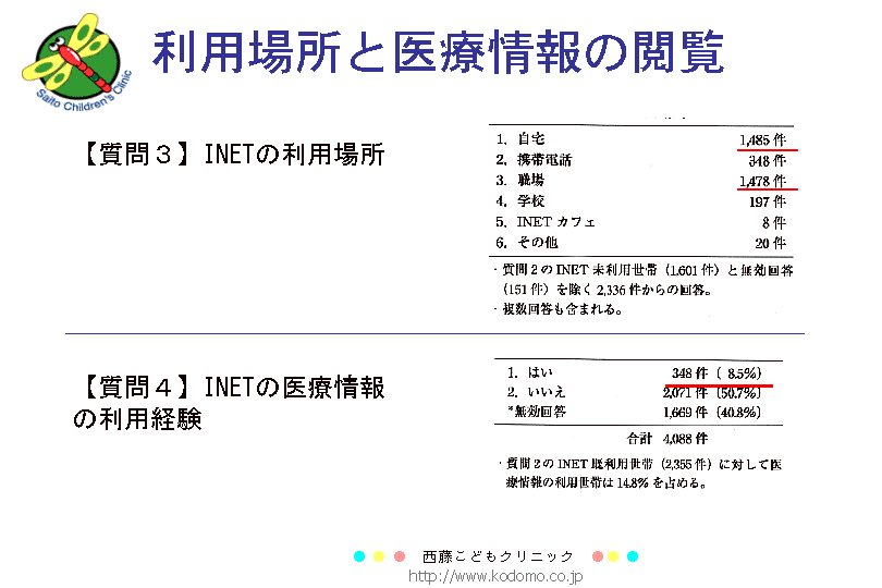 家族が子どもの健康や病気のことでINETを利用した経験については、そうした利用のある世帯は348件回答がありました。これは回収総数4088件に対して8.5%を占めました。