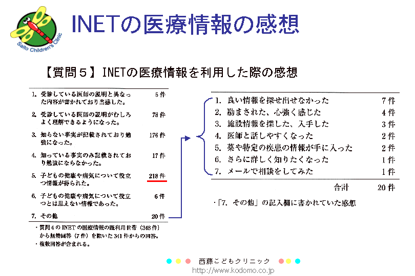 子どもの健康や病気の事でINETを利用した時の感想について自由回答をまとめてみました。「4. 子どもの健康や病気について役立つ情報が得られた」が218件、「3. 知らない事実が記載されており勉強になった」176件などが多数選ばれていました。